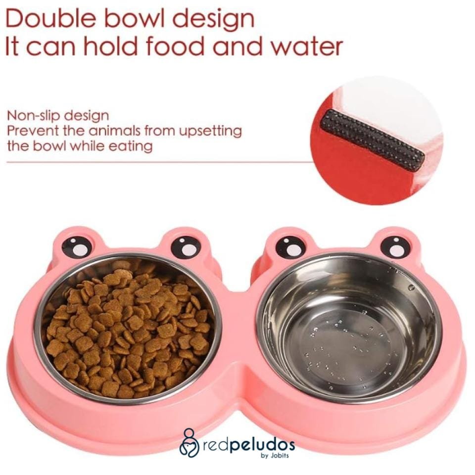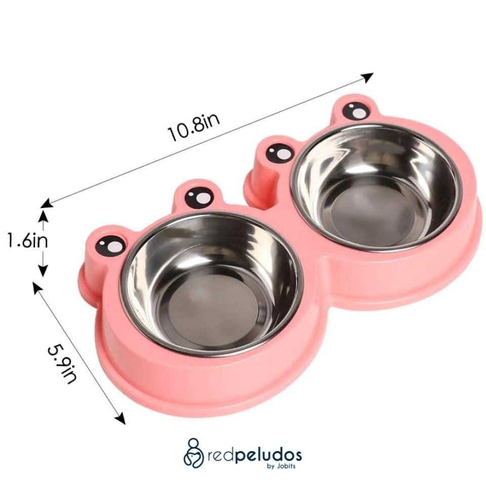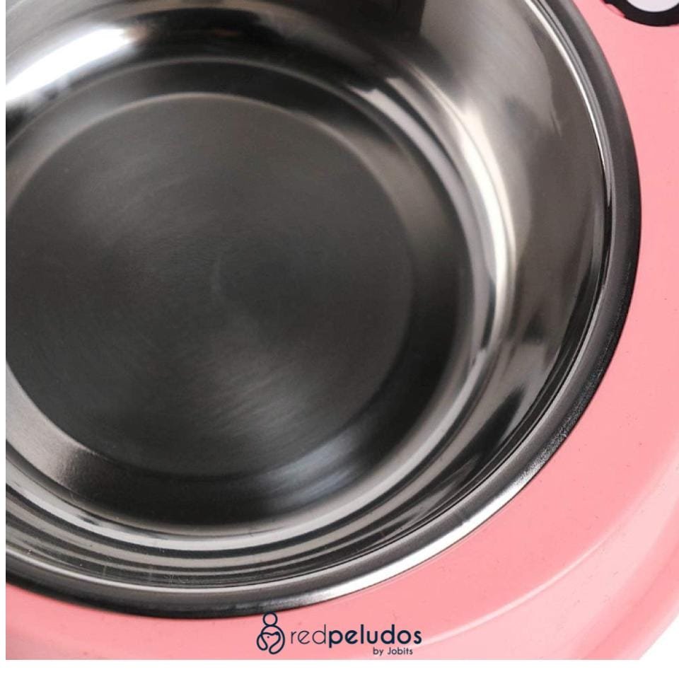 Comedero doble de acero inoxidable con base antideslizante. Práctico, higiénico y fácil de limpiar. Ideal para agua y comida.