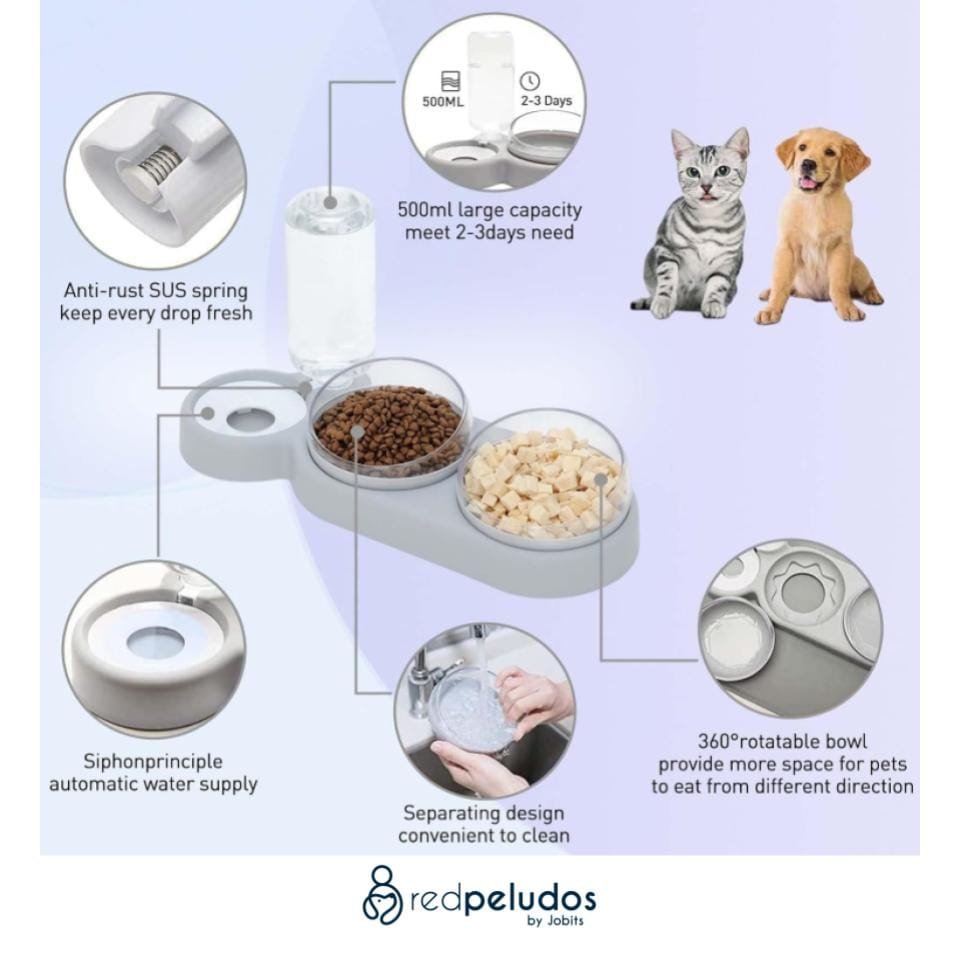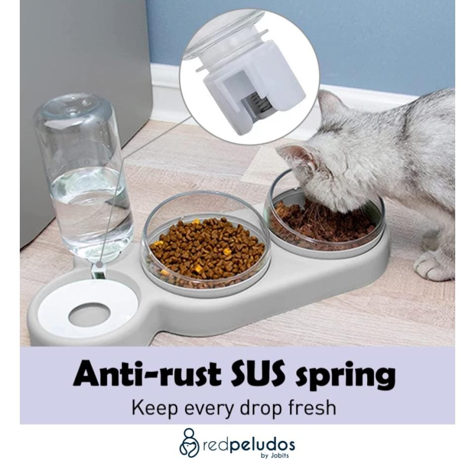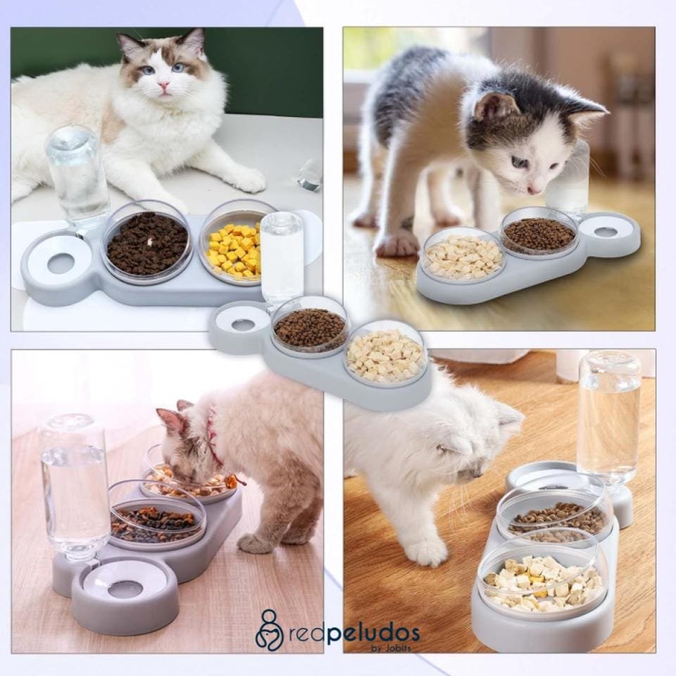 Dispensador automático de agua y comida con platos inclinados antivómitos. Sistema por gravedad, fácil de limpiar y recargar.